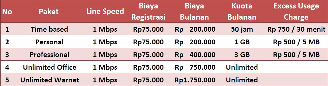 Dengan kecepatan 1 Mb/s downstream dan 256 kb/s upstream dan harga yang terjangkau, Anda dapat melakukan koneksi internet dengan kecepatan tinggi dengan durasi yang lebih panjang.