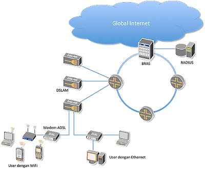 Setiap unit Speedy terhubung langsung dengan koneksi gigabit pada jaringan metro ethernet ke perangkat BRAS yang merupakan gerbang Speedy ke luar. Dari BRAS, user akan dihubungkan ke: